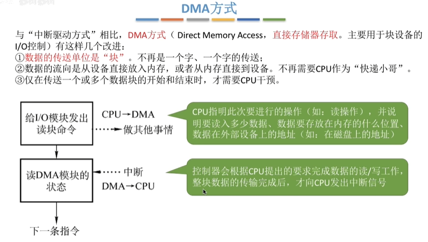 缺点:每个字在I/O设备与内存之间的传输都需要经过CPU,频繁的中断处理会消耗较多的CPU时间