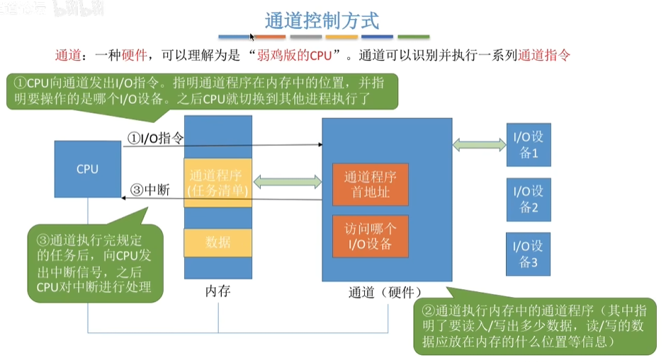 缺点:实现复杂,需要专门的通道硬件支持优点:CPU、通道、1/O设备可并行工作,资源利用率很高。